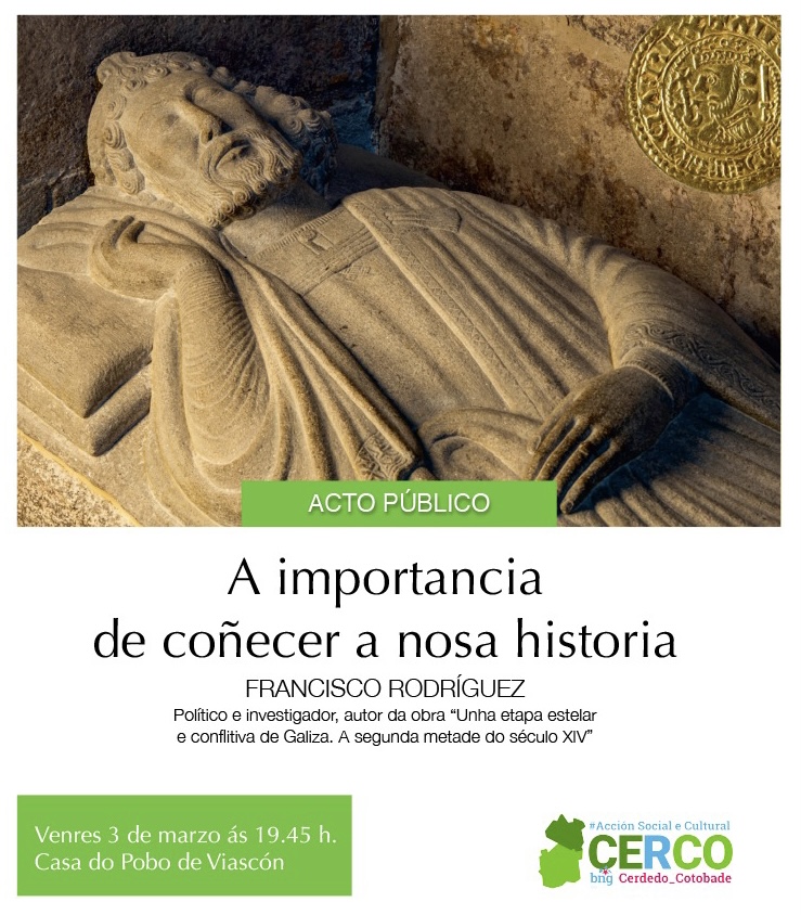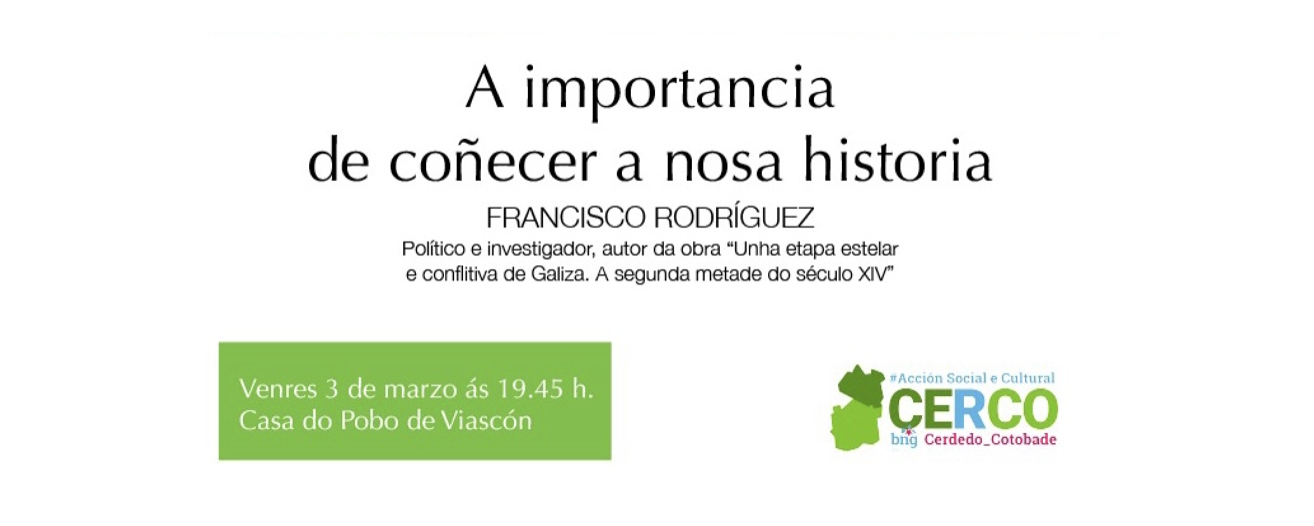 Acción Social e Cultural “Cerco” de Cerdedo-Cotobade organiza para este venres, 3 de marzo ás 19.45 h. unha charla na Casa do Pobo de Viascón para abordar a importancia e necesidade de coñecermos a nosa propia historia. A charla será impartida polo coñecido político, ensaista e investigador, Francisco Rodríguez Sánchez, que ven de publicar recentemente unha magna obra titulada “Unha etapa estelar e conflitiva de Galiza. A segunda metade do século XIV”, que, en dous extensos e documentados volumes, aborda a etapa medieval de normalidade e esplendor do reino de Galiza, e a crise da segunda metade do século XIV. Esta obra deita luz sobre o noso pasado medieval e as deformacións e ocultacións que se produciron sobre este periodo, e contribúe a coñecernos este tempo histórico fundamental da nosa historia.